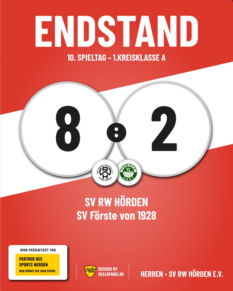 Das Spiel wurde nach dem 7:1 insgesamt etwas ruhiger. J. Leimeister konnte nach einem Hördener Ballverlust im Mittelfeld noch einen Treffer für die Förster markieren. Der RWH hatte aber in der 74. Spielminute das letzte Wort: Y. Minde spielte einen tiefen Ball auf N. Freye, dieser ließ zwei Förster stehen und flankte auf den zweiten Pfosten, wo S. Marx nur noch auf F. Saar ablegen musste. Saar verwandelte sicher und machte nach Freye ebenfalls seinen dritten Treffer des Tages. Ein toller Spielzug der Rot-Weißen!