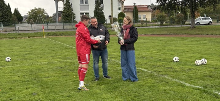 Abteilungsleiter Fußball M. Deppe überreichte vor dem Spiel gemeinsam mit der Mannschaft ein Präsent an Geschäftsführer Stefan Henkel und seine Frau Daniela und bedankte sich im Namen des Vereins für die großzügige Spende.